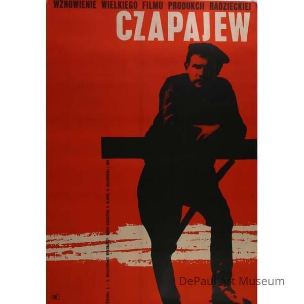 Polish film poster for Czapajew. On the right side of the composition, a man wearing a hat leans against a horizontal post. The man is printed in black ink, with the red background serving as the highlights. The name of the film is printed in white bold font at the top of the poster.