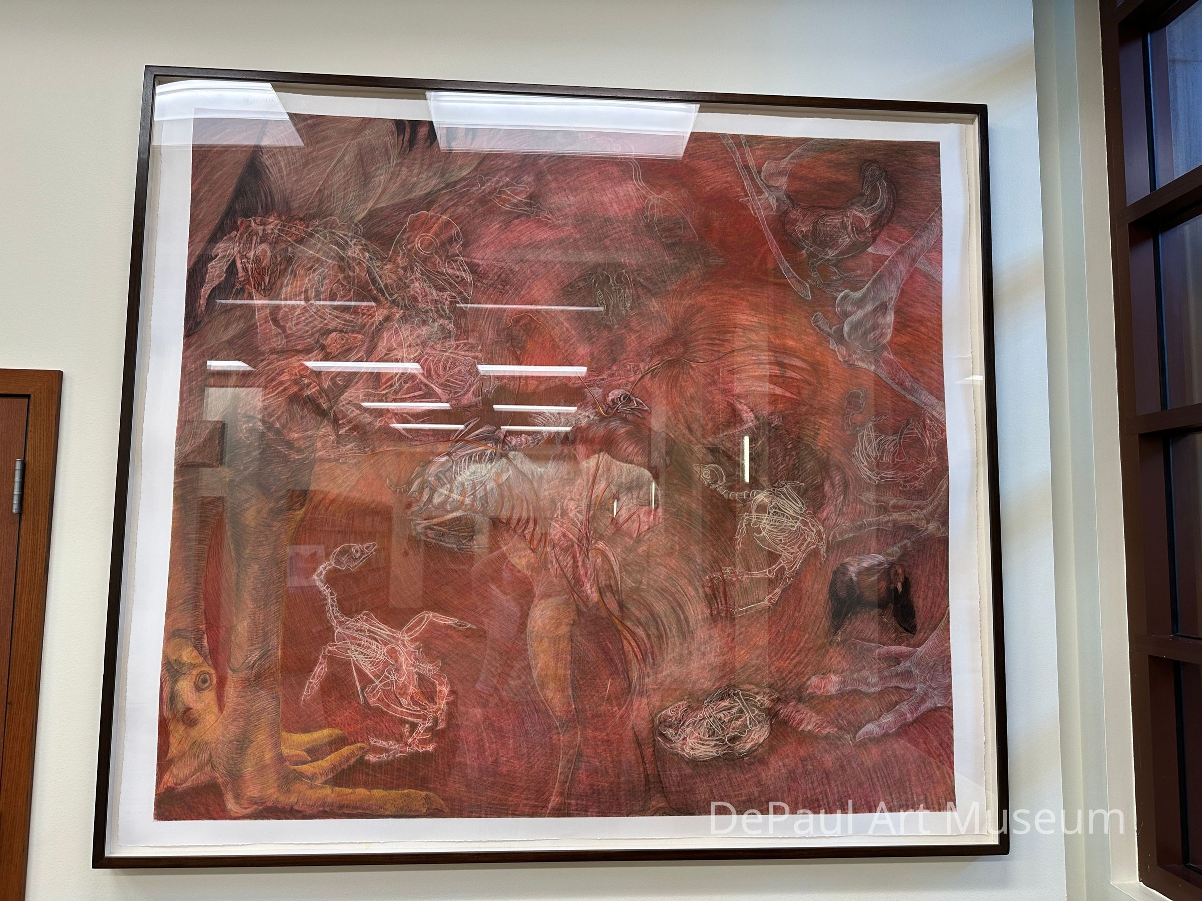 Pink and orange figures on a red background depicting various chicken figurines. Chicken feet can be seen in the bottom left corner.Context