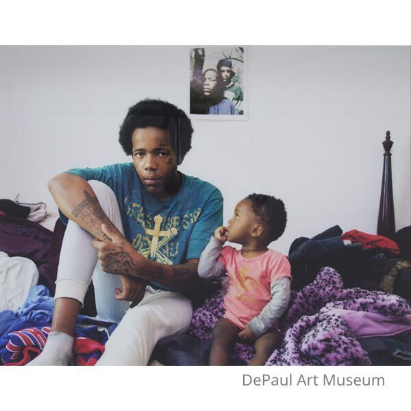 Darielle and Dasia D'Amato, Paul 2012 Young African-American male sitting in messy bedroom accompanied by African-American female toddler.