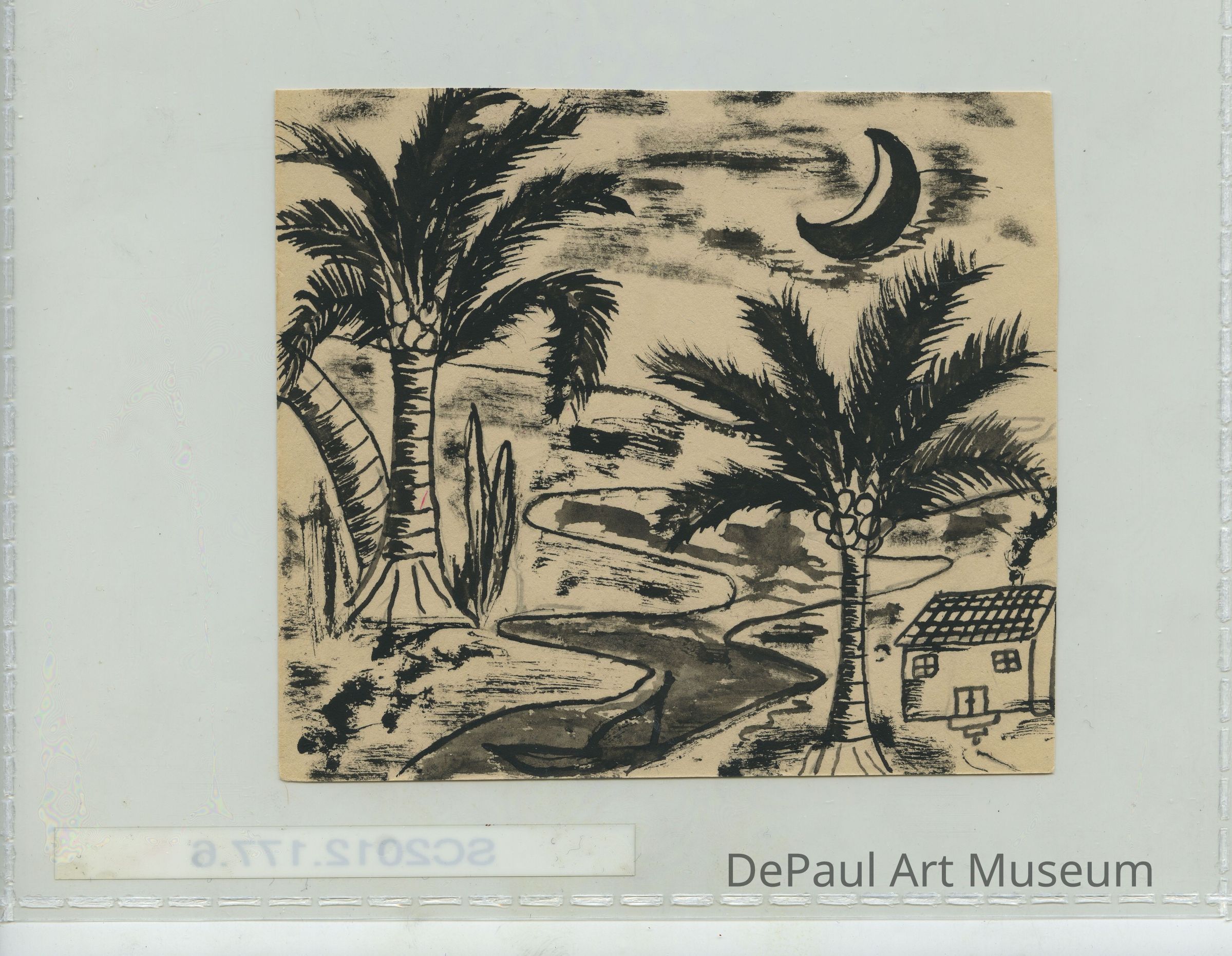 Black ink drawing of two palm trees, a winding path between them, a small house in the bottom right corner, and a cresent moon in the top right corner. On the verso there is a hastily drawn sketch in graphite of a tree and some unidentifiable undulating lines. Drawing may have been iincluded in a letter to Samuel Koffler.Artwork Details