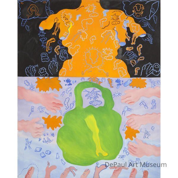 Rocca’s 1968 Dream Girl explores a world of teenage preoccupations with body image, accessories, and fashion trends. Rocca presented her vision with a dizzying richness of forms and ingenious compositional devices like the divided picture field and the shifting scale of body images such as feet, hands, legs, and a large torso in the upper section of the composition. In the top corners are sleeping heads laid on pillows, indicating the importance of dreams as sources of the artist’s imagery and subjective concerns. Rocca’s inventive employment of this personal content gives her work an affable and good-natured charm despite its occasionally alarming details. – Dennis Adrian, from "Re: Chicago"Label