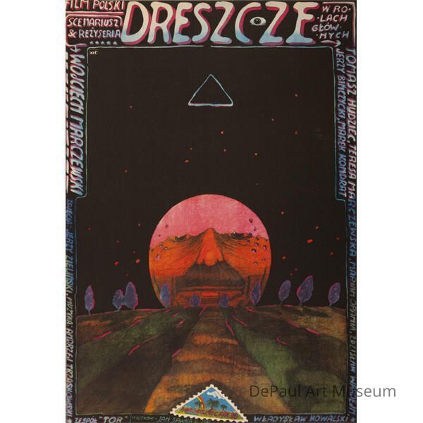 Many names of cast members and directors. At the top, the title, "Dreszce" is depicted. To the left of the title, the translated phrase is “Polish Film” “Script & Directing”. The largest name, going down the left-hand side of the poster, is the film’s director ‘WOJCIECH MARCZEWSKI’.Language