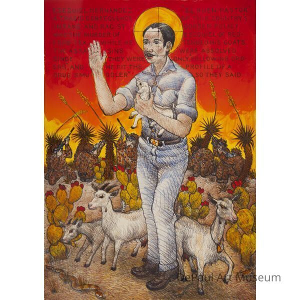 Updating the biblical description of Christ as a Good Shepherd who “lays down his life for the sheep,” a metaphor for Christ’s sacrifice of his own life to ensure the salvation of sinners, Luis Jiménez’s El Buen Pastor references the 1997 murder of 18-year-old high school student and shepherd, Esequiel Hernández Jr. Hernández was tending to his sheep close to the U.S. / Mexico border where troops had been deployed in order to stop the movement of drugs. With his flock having recently been the victim of attacks by local wildlife, Hernández shot his rifle into the distance at what he thought was a wild dog. Little did he know that this was actually a camouflaged group of three U.S. Marines who fired back, killing Hernández. Jiménez’s print depicts the young Hernández as a saintly figure who, with a lamb cradled in his left arm, holds up his right hand as if miming the now all too common “don’t shoot!” to the crouched gunmen depicted in the background. The halo-like circle around the figure’s head is ironically depicted as the crosshairs of the lethal weapon.