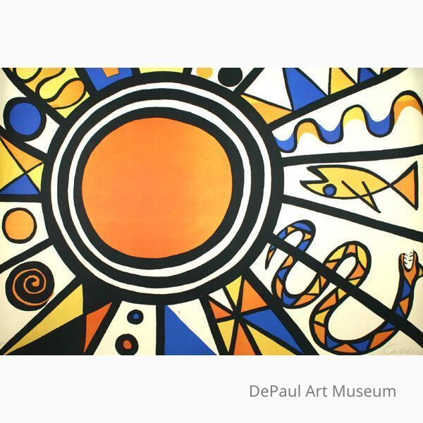 Image of radiating sun with black outlined patterns and animal forms.Acquisition
