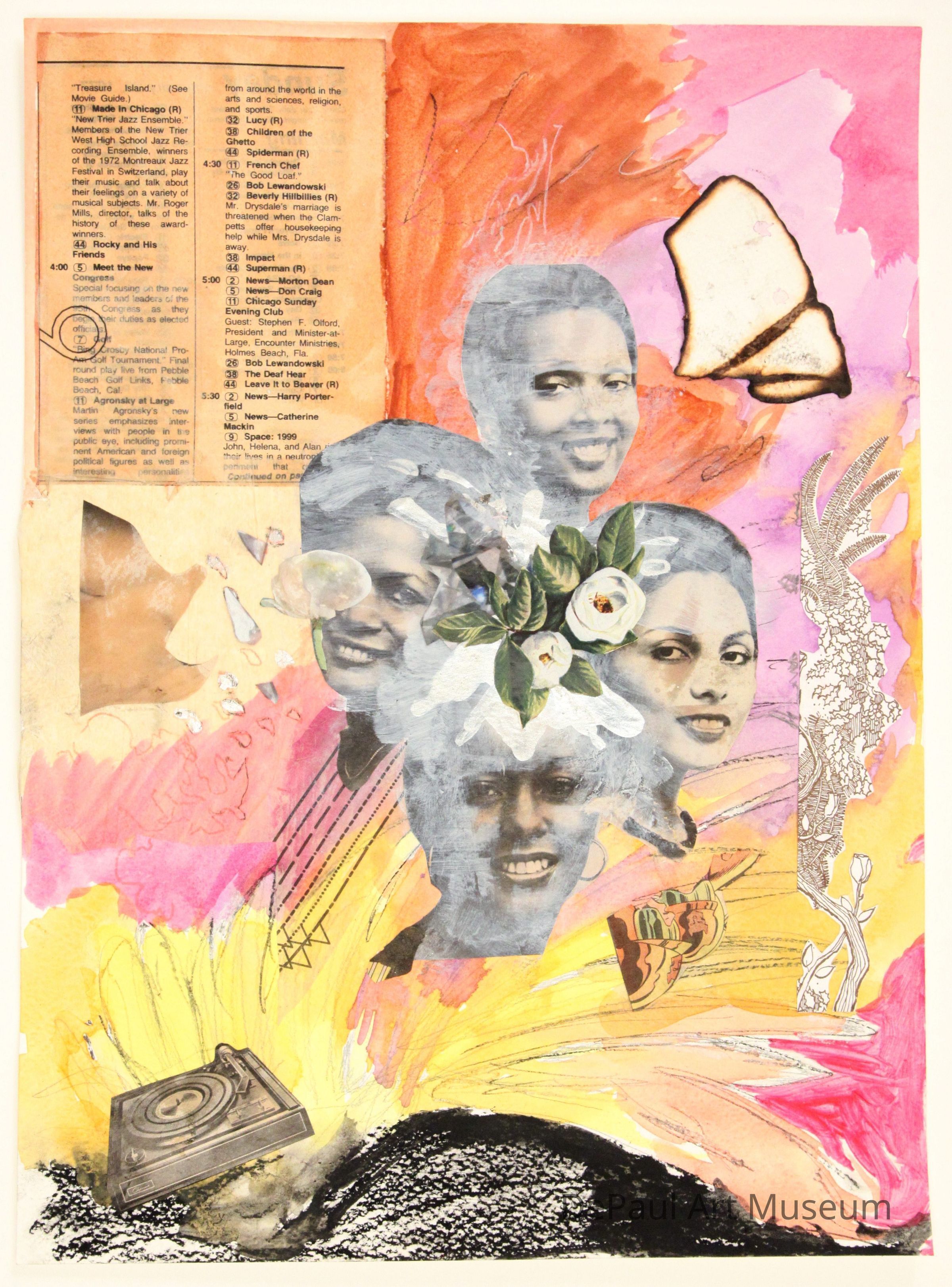 Watercolor, acrylic, charcoal, pencil, and collage