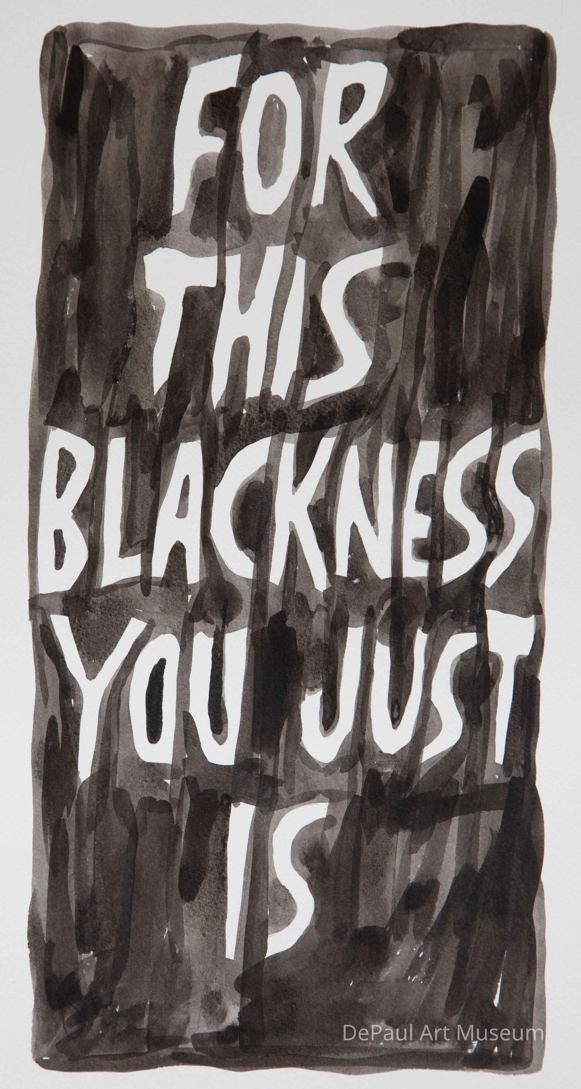 The artist’s site-specific installation in DePaul Art Museum’s CTA-facing billboards allows audiences to rethink and unlearn our relationships to the issues of race, politics, and progress through the act of wordplay and the power of individual words in her artwork. She invites each of us to read the work through our heavily loaded personal and collective histories, perspectives, and observations and to question the artist’s own motive and relationship to the concepts of Blackness and blackness regarding race and color theory in social and art historical contexts. What is in a name, a label, or a color? How does the power of words change with our inflection of tone as we perform and pronounce them?