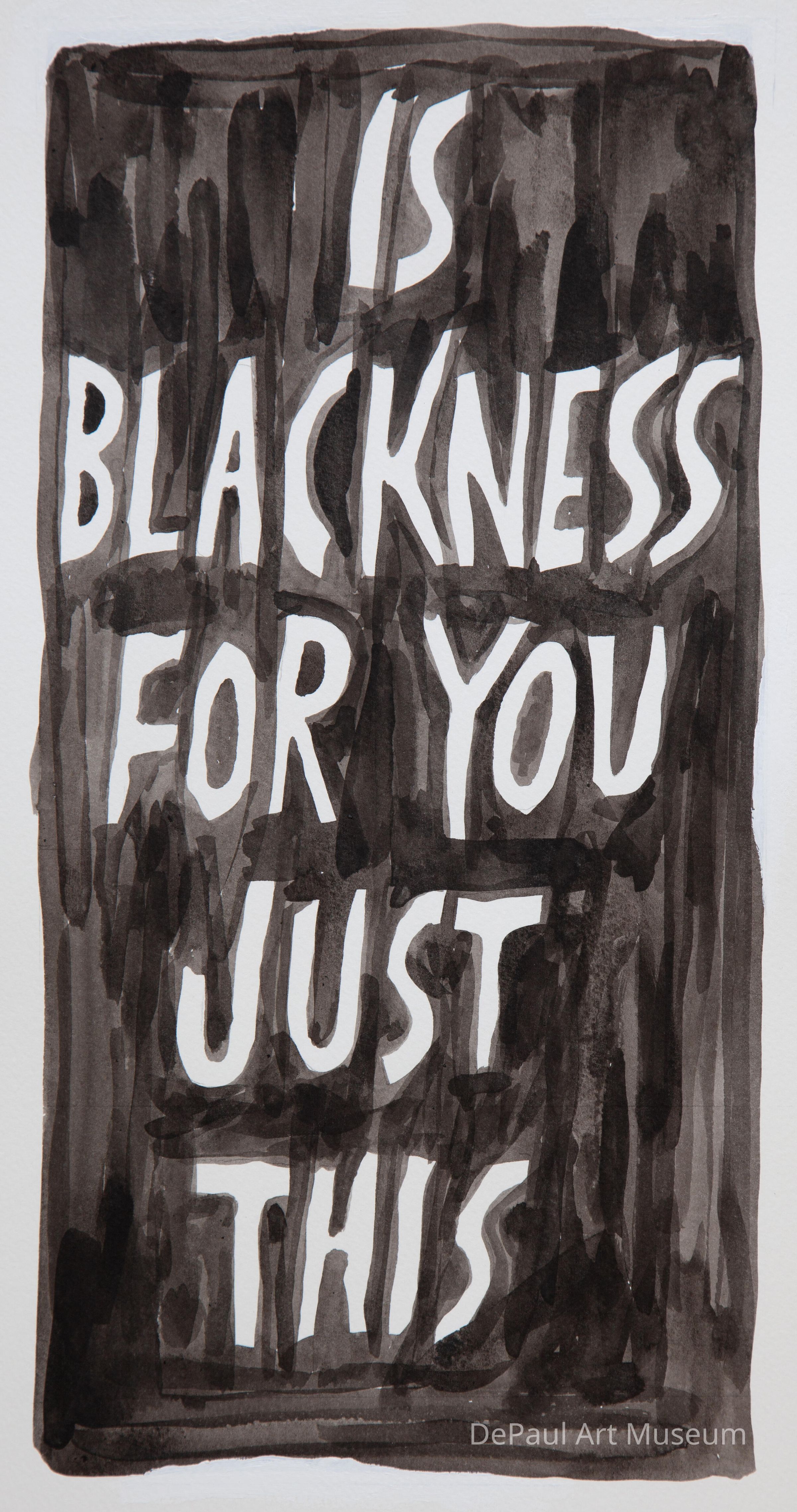 Black ink wash painting forming letters that reads "Is Blackness For You Just This"Context