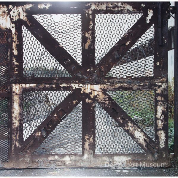A photograph of two fences, one chain link and the other thick x shaped rusted metal with an out of focus field in the background.Artwork Details
