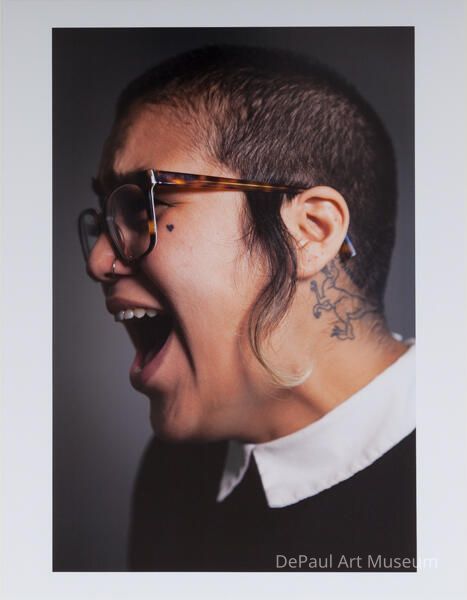 Side view of woman in glasses and white/black collared shirt screaming