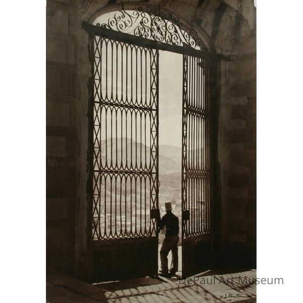 Sepia-toned photo of a man opening a tall ornate wrought iron gate and gazing out at the valley beyond.Acquisition