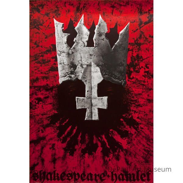 This is a poster for a theater production of Hamlet. It’s style is abstract-expressionist like, with a crackled red background beneath black void with hints of red eyes wearing steely, jagged crown.Artwork Details