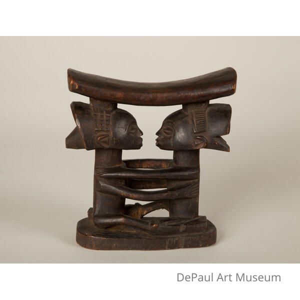 Carved wood headrest. Base is two figures with arms around each other. Possible fake.Acquisition