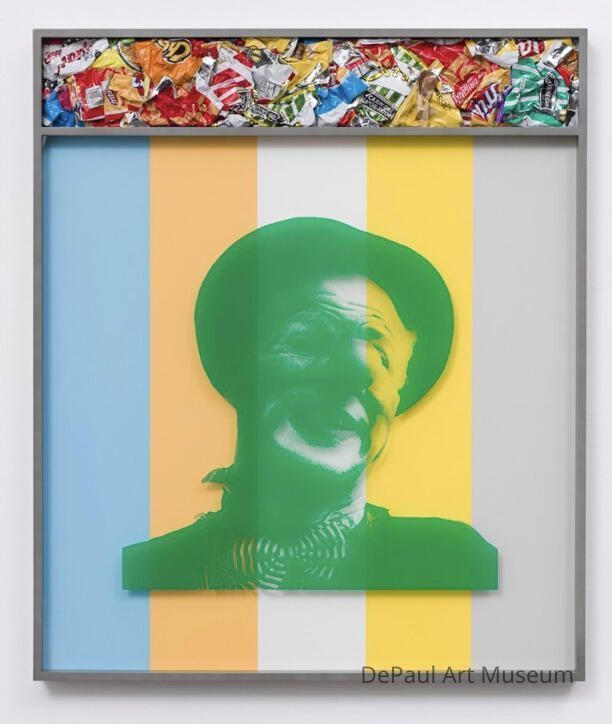Andrews uses an aluminum frame to encase and display in the upper section empty packages of chips and snack and an image of a clown below.
