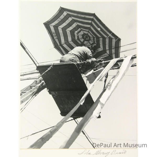Hombre y cables de telefono/ Man and telephone wires Bravo, Lola, Alvarez 1930 Photo from below, looking up at a man working on telephone wires.