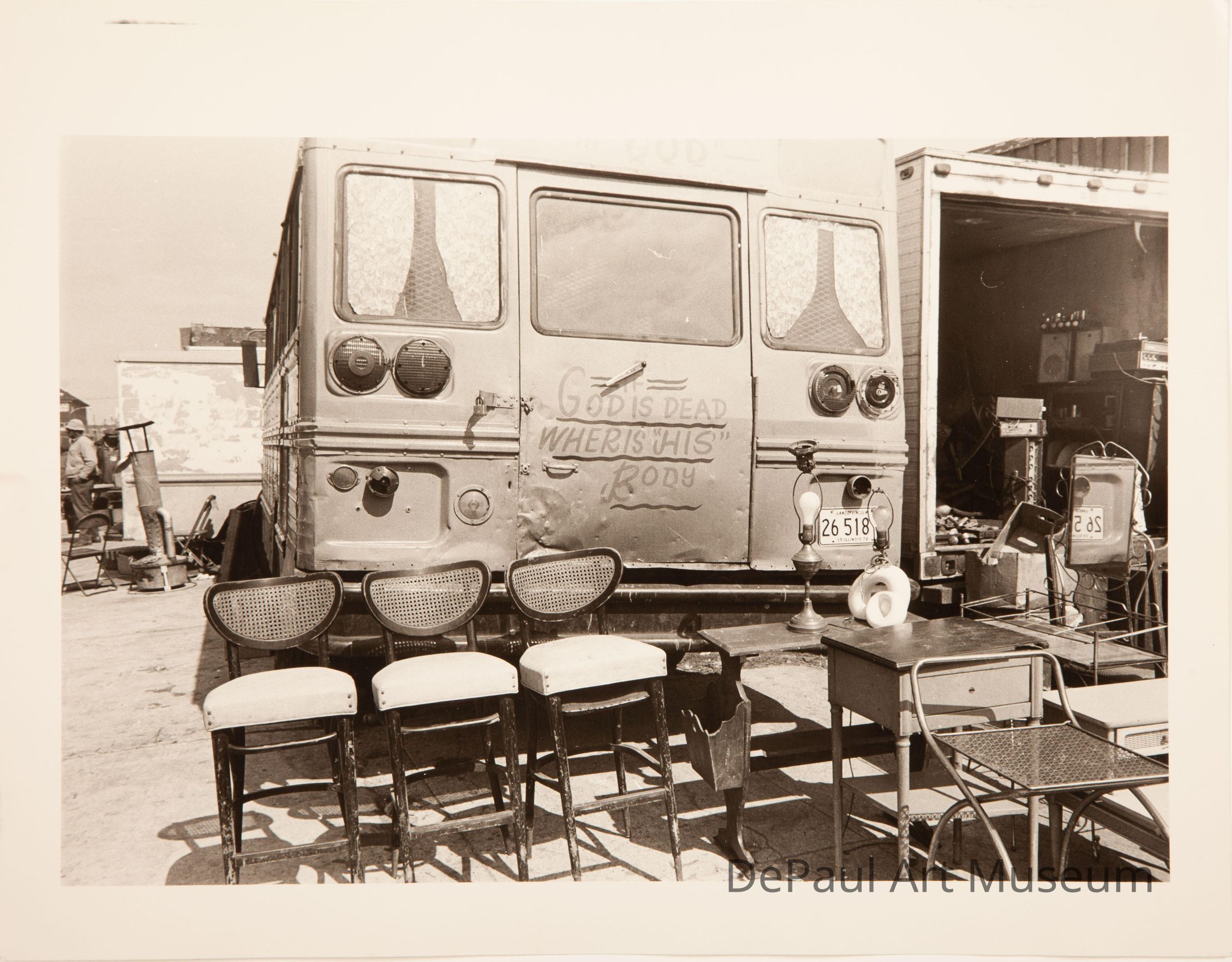 Back of a van with the words "If God is dead where is "his" body" written on the back. Three chairs and other various furniture items are sitting on the street in from of the van.Context