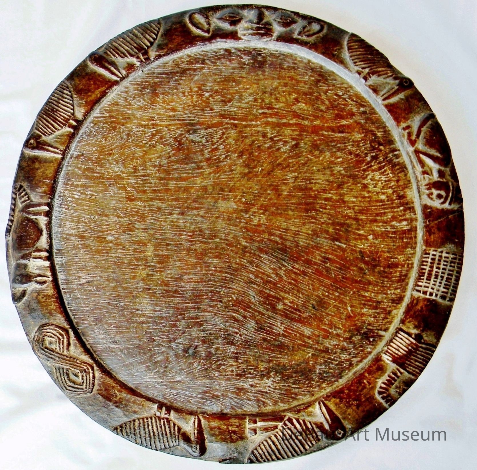 circular disk with raised outer ring adorned with reliefs of animals, people, and patters.Acquisition