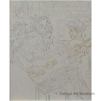 Man playing guitar. Artists preliminary sketch for lithograph