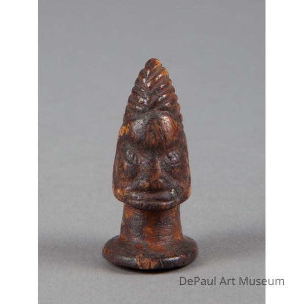 Tiny stylized human face with conical hat, large eyes, and round base after the neck.Acquisition