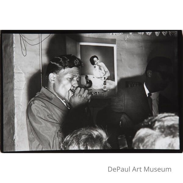A man playing a harmonica in front of an ad for Schlitz.Acquisition