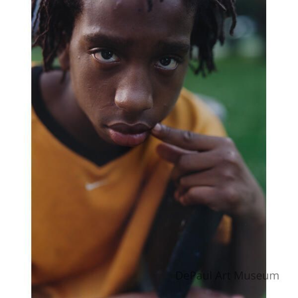 Kenneth Bey, Dawoud 2001 African American boy with dreadlocks and yellow shirt poking his index finger into his cheek and staring into camera