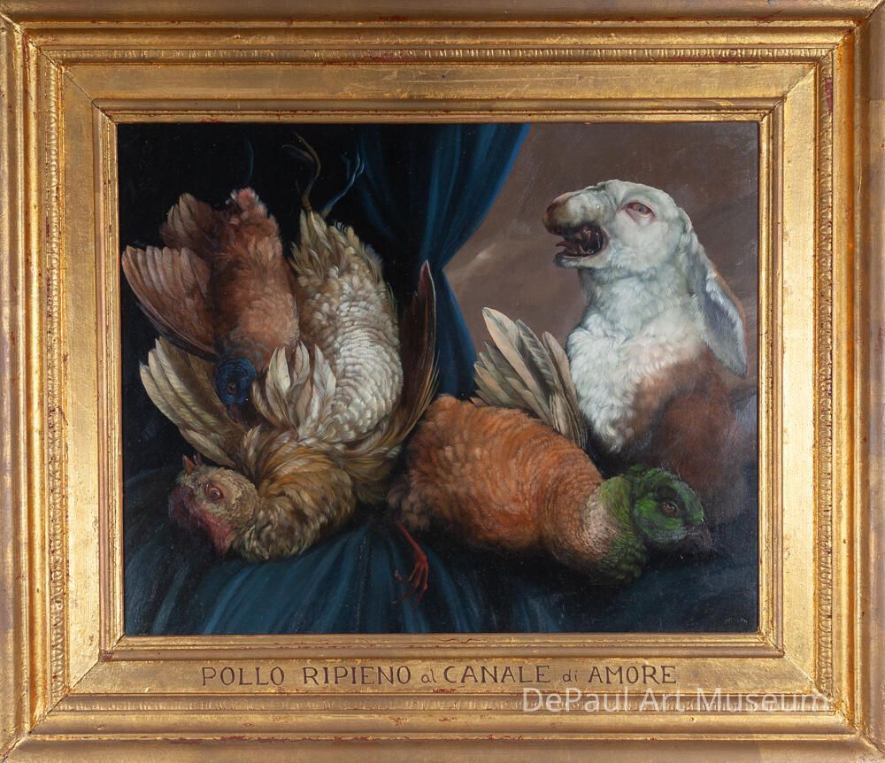 The history of still life painting in art dates back to Egyptian funerary drawings, but is a tradition that has continued into contemporary art history as well. Grounded in classical composition, light quality, and the subject matter of 17th century European still life painting, specifically vanitas, Laurie Hogin’s work Pollo Ripieno al Canale di Amore provides a terrifying alternative to the genre. Historically, the vanitas paintings displayed the grandiosity and opulence of aristocratic kitchens and table settings, with their exotic game and gilded dinnerware. Instead, as an environmental activist, Hogin points out the social parables in nature caught in the midst of an indulgent human civilization. The title Pollo Ripieno al Canale di Amore, translated literally is stuffed chicken at the channel of love.Acquisition