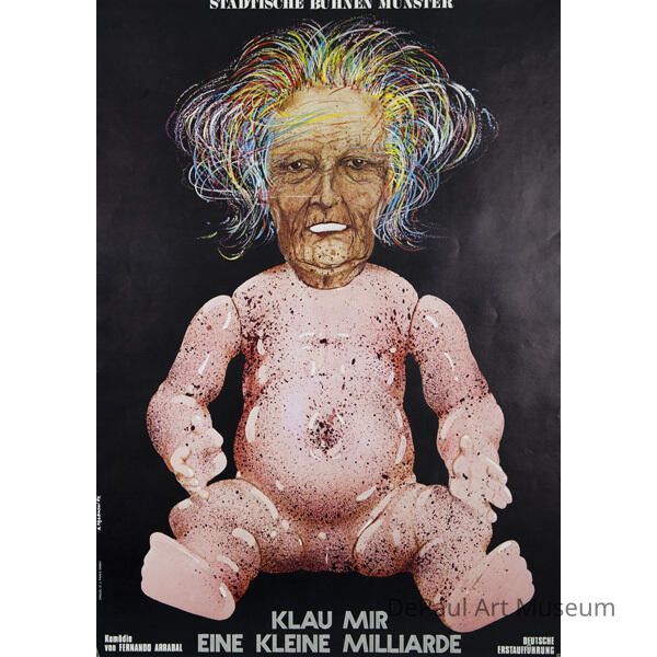 This poster was made for Das Theater Münster, formerly Städtische Bühnen Münster, in Munster Germany and its production of Klau Mir Eine Kleine Milliarde (literally translating to "Grab Me a Little Billion") in 1979. The poster was “commissioned by German theater director Dr. Erdmut August who also created what may be the world's largest international theater poster archive with holdings of 16,000 different posters by many of the world's leading poster artists.