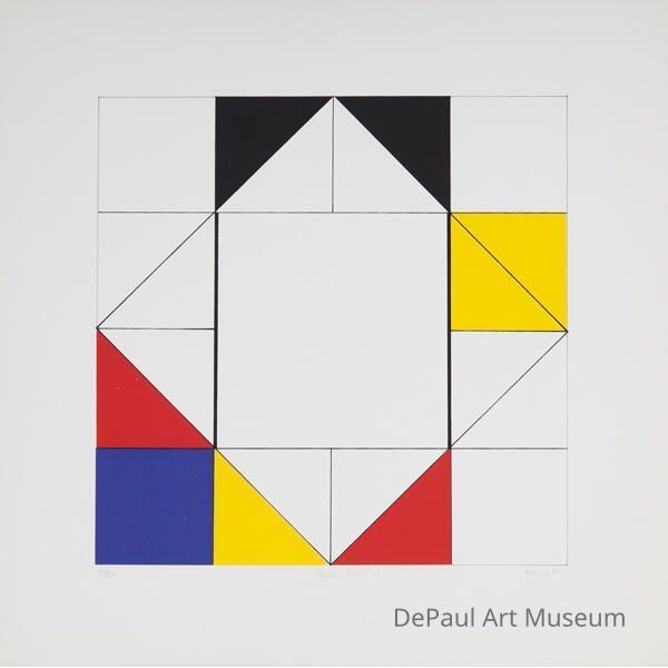 Tilted square among 13 smaller quadrants with primary colored traignles and squares.