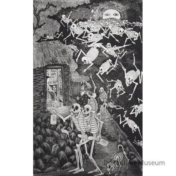 Numerous skeletons descending from a moon with eyes. Two skeletons walk together in the foreground with a bottle and a dog skeleton behind.
