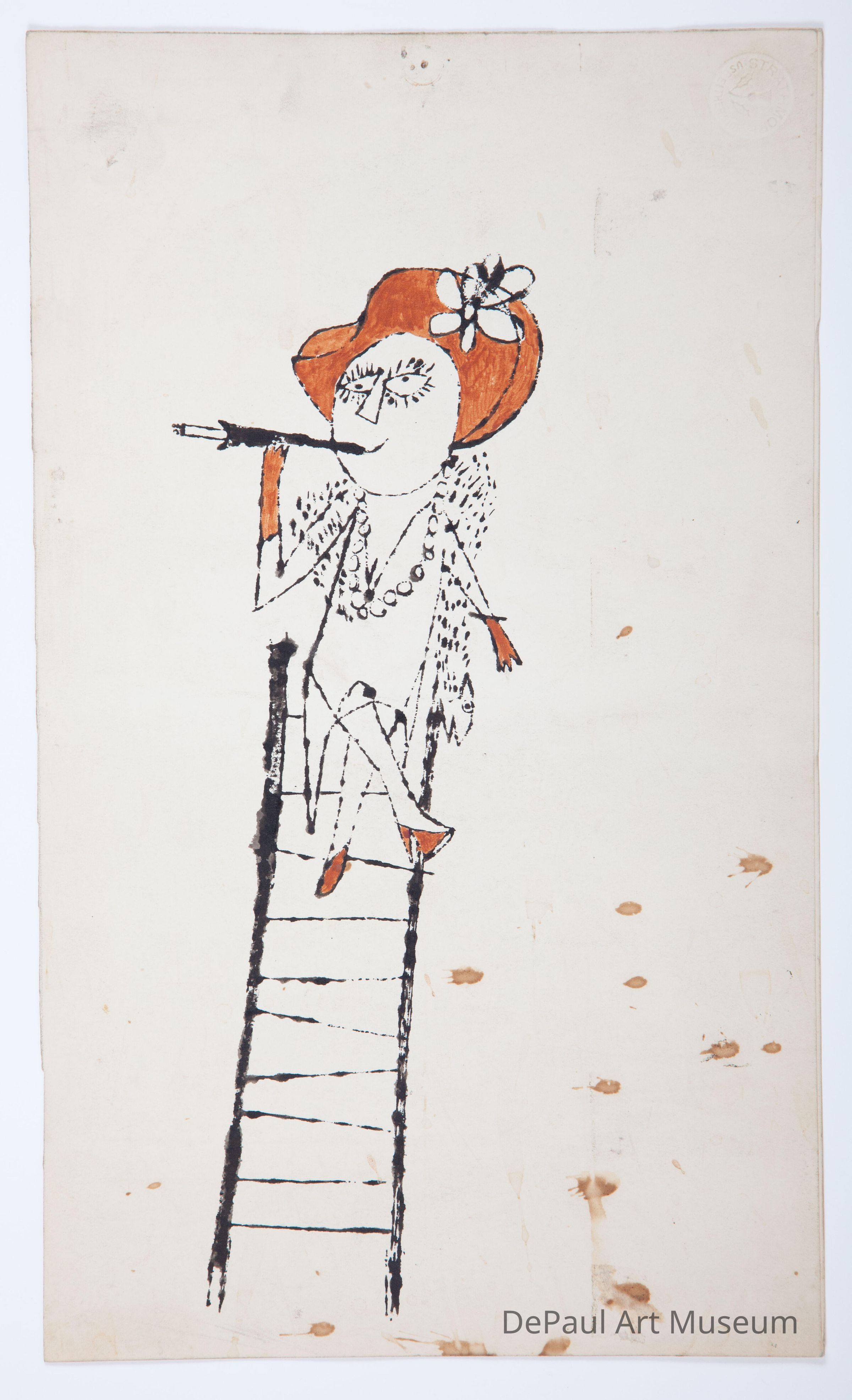 Lady sitting on a ladder smiling, smoking a cigarette in a cigarette holder. She wears an orange hat with a flower, orange gloves and shoes.Context