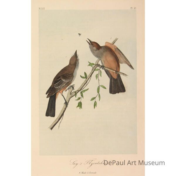 John J. Audubon’s (1785-1851) book ‘Birds of America’ was originally printed with “Double Elephant folio” engravings, meaning 435 life size images of North American birds. Between 1840 and 1869, several editions of a smaller (“octavo”) version of the book were printed. The prints found in DePaul’s collection are from this later era, and were printed by J.T. Bowen in Philadelphia. Bowen used a “camera lucida” to project the large engravings on lithographic stone which was then hand drawn and hand painted using watercolors. These smaller sized books made Audubon’s work accessible to a wider audience, and helped his art gain the reputation it still holds today.Acquisition