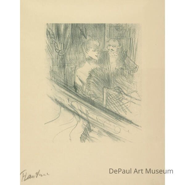 Voyeuristic scene of an elegant couple standing in an opera box; the woman's back is to the viewer and the scene is on an angle.Artwork Details