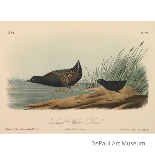 John J. Audubon’s (1785-1851) book ‘Birds of America’ was originally printed with “Double Elephant folio” engravings, meaning 435 life size images of North American birds. Between 1840 and 1869, several editions of a smaller (“octavo”) version of the book were printed. The prints found in DePaul’s collection are from this later era, and were printed by J.T. Bowen in Philadelphia. Bowen used a “camera lucida” to project the large engravings on lithographic stone which was then hand drawn and hand painted using watercolors. These smaller sized books made Audubon’s work accessible to a wider audience, and helped his art gain the reputation it still holds today.Acquisition