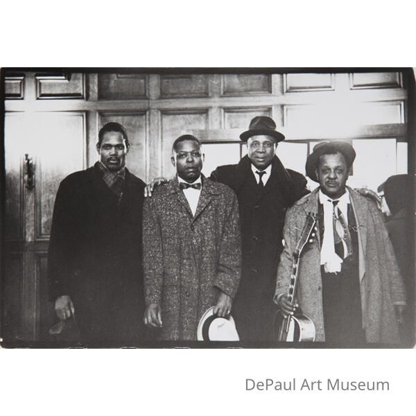 Left to Right: Big Walter Horton, Floyd Jones, Sunnyland Slim, Big Joe Williams arrive at the University of Chicago's Mandel Hall for their 1962 Folklore Society Concerts