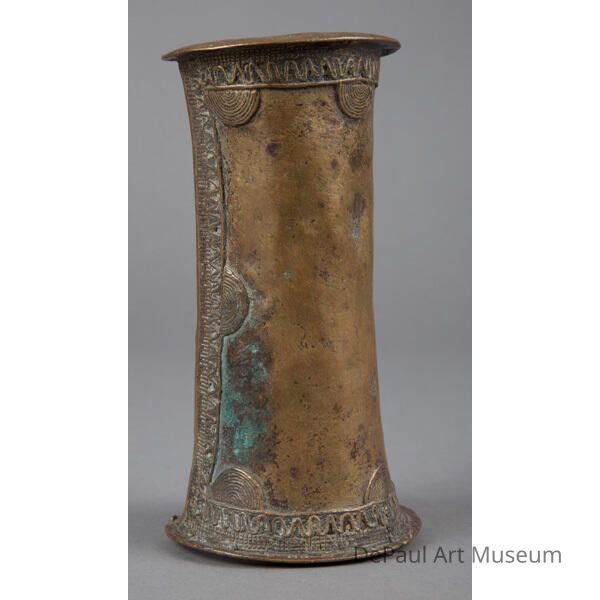 cylinder with sides gently curving inward with curving lines and shapes on the edges