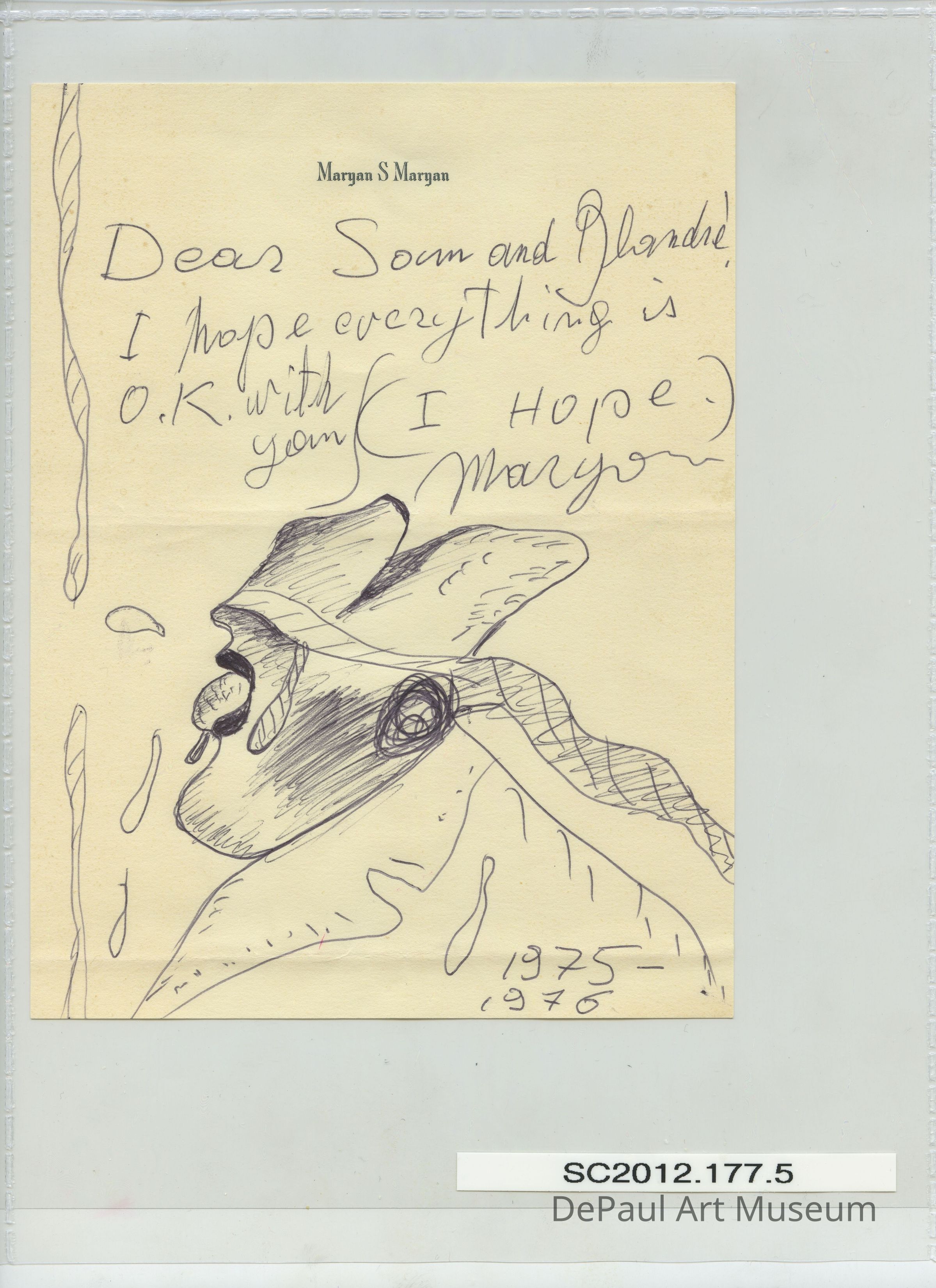 Letter from the artist Maryan to Samuel and Blanche Koffler. "Dear Sam and Blanche, I hope everything is O.K. with you (I hope.) Maryan" with ink drawing on the bottom half of the paperAcquisition