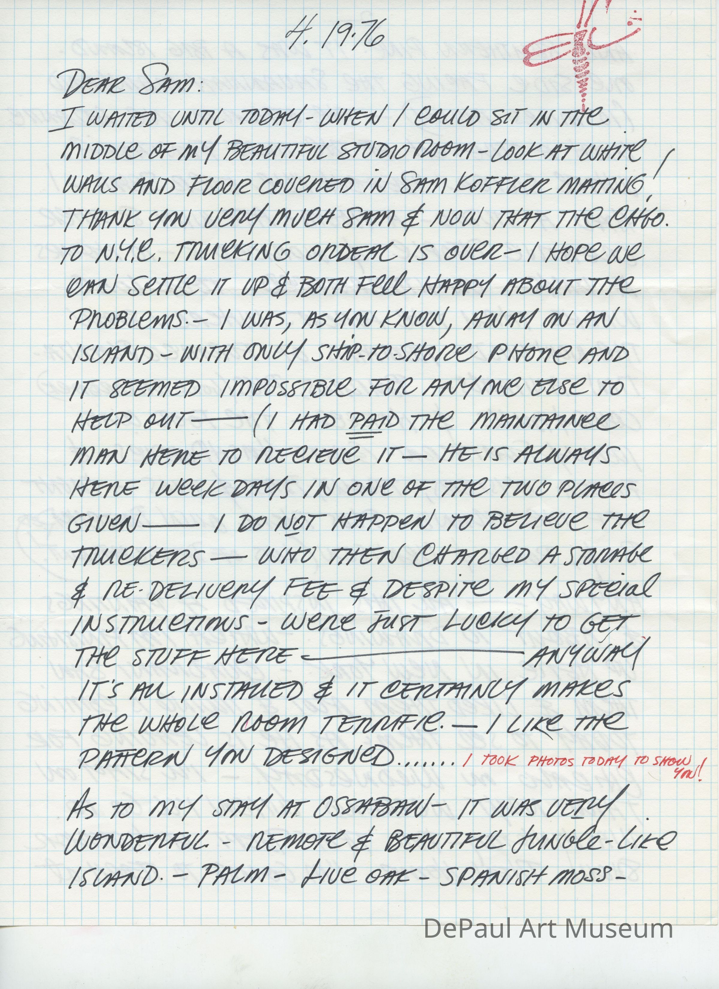 Letter from Ellen Lanyon to Samuel Koffler, thanking him for a flooring service he did for her (his profession) and describing an artist's retreat she went to and her experience there, as well as discussion of a party which the Kofflers were to be hosting shortly. Drawing in ink on the bottom half of the second page of a foot in front of a patterned floor.Acquisition