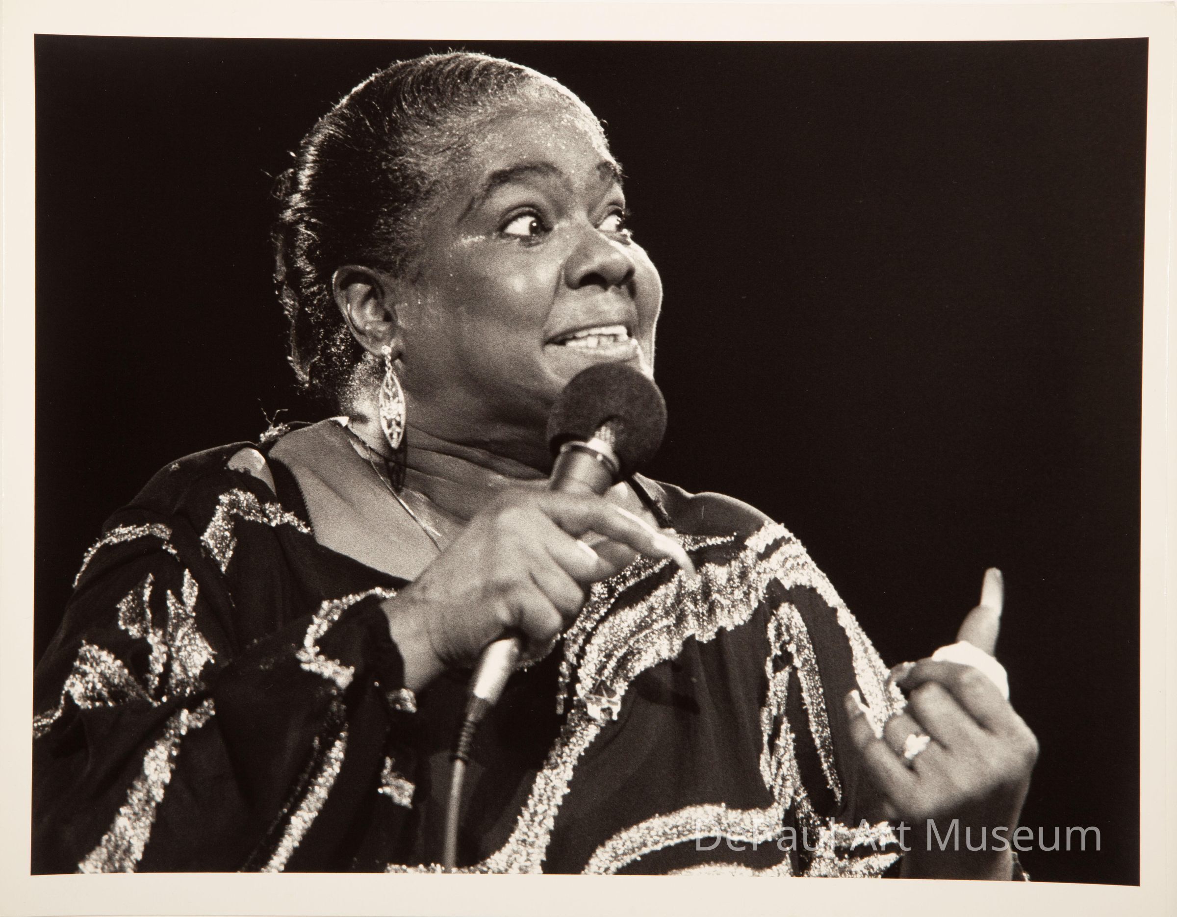 Linda Hopkins in profile, singing into a microphone.