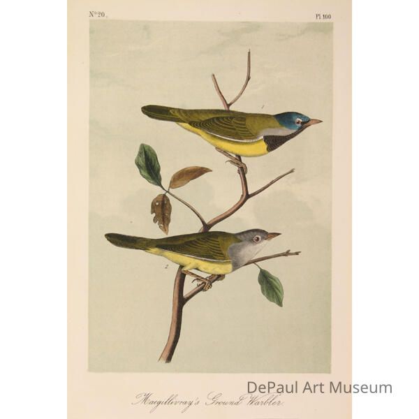 John J. Audubon’s (1785-1851) book ‘Birds of America’ was originally printed with “Double Elephant folio” engravings, meaning 435 life size images of North American birds. Between 1840 and 1869, several editions of a smaller (“octavo”) version of the book were printed. The prints found in DePaul’s collection are from this later era, and were printed by J.T. Bowen in Philadelphia. Bowen used a “camera lucida” to project the large engravings on lithographic stone which was then hand drawn and hand painted using watercolors. These smaller sized books made Audubon’s work accessible to a wider audience, and helped his art gain the reputation it still holds today.Acquisition