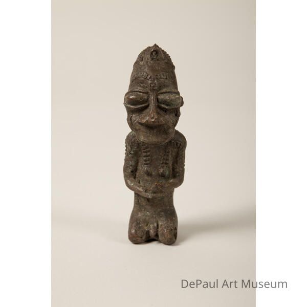 Male kneeling, smiling figure, ornamented hat, circular protrusion from forehead/front of hat.Acquisition