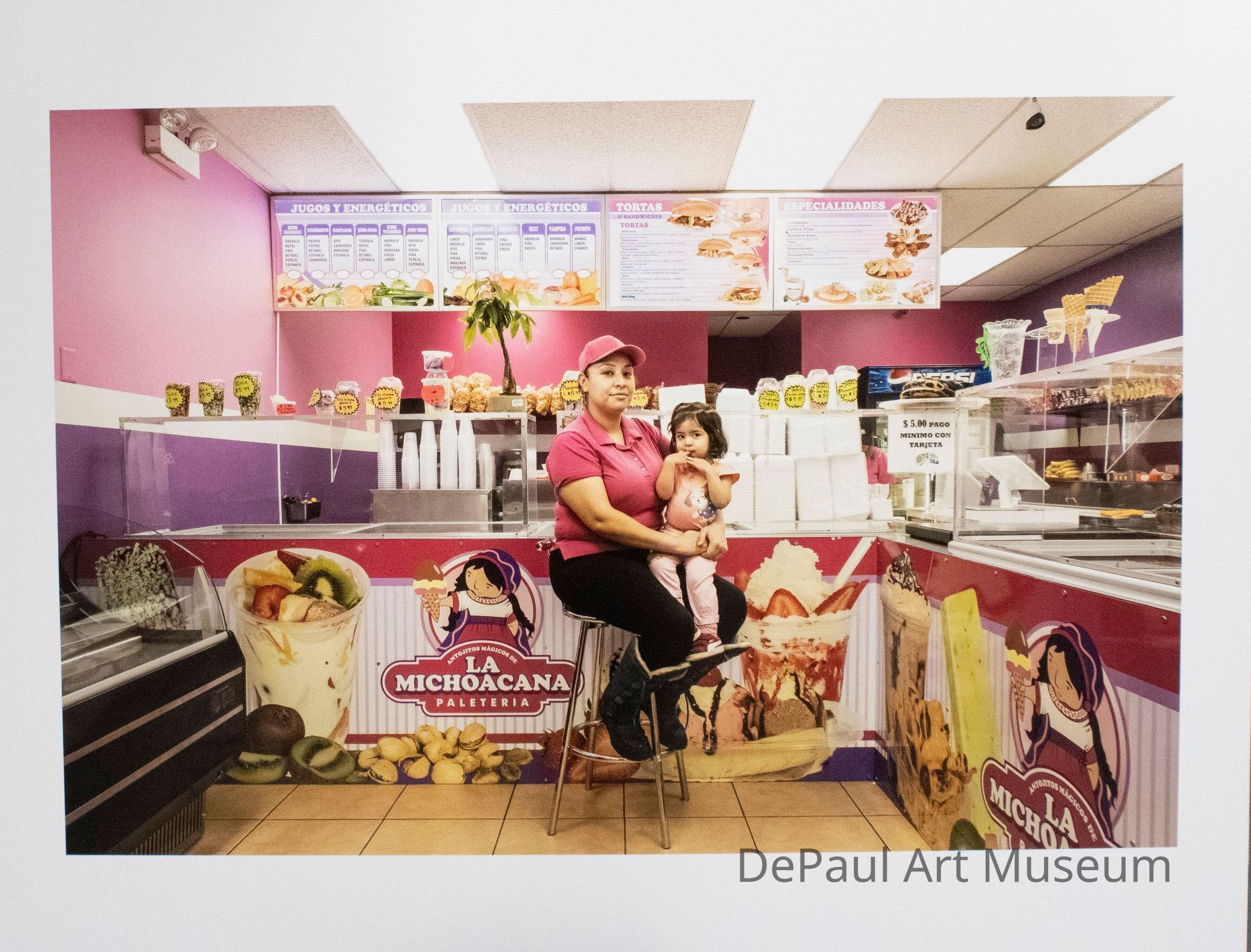 Photograph of Maribel (mother) and Maya (daughter) in La Michoacana Plateria in Chicago's Kimball neighborhood. Maribel sits on a stool holding Maya in front of the freezer counter. The shop is colorfully decorated in pinks and purples.Context