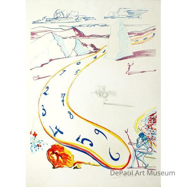 A 'melting' clock, a figure with staff seated, a figure on horseback and a figure with a bow and arrow on a rocky landscape.Artwork Details