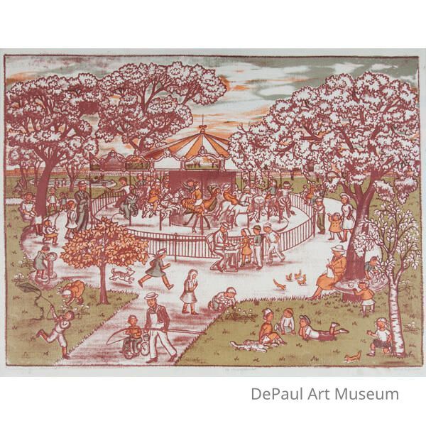 Ethel Spears (1903 - 1974) Merry Go Round Color Lithograph signed, titled, and dedicated to Marjorie Hartman, a Texas artist 18x24", $750, Spears was a Chicago artist who also painted in NYC, Her city scenes are filled with gaiety and little people