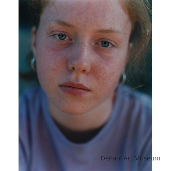 Michelle Bey, Dawoud 2001 Woman with red hair, freckles, and blye eyes in purple shirt staring into camera