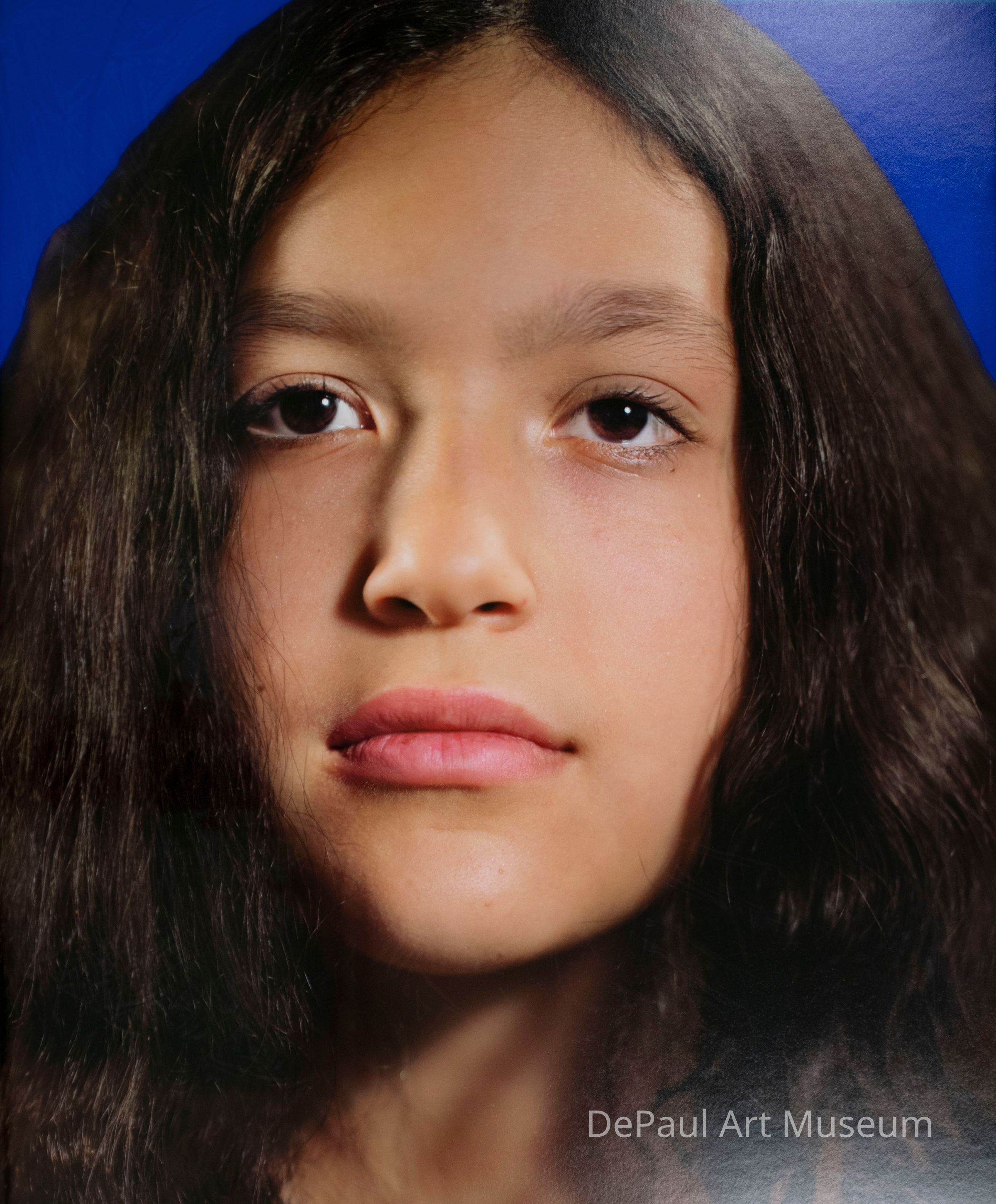 Portrait of a girl with long brown hair and brown eyes looking at the camera with a blue background.Context
