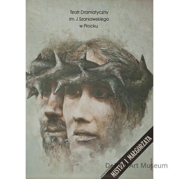 This is a Polish theater poster advertising the play Mistrzi I Malgorzata. The composition consists mainly of grey and brown tones, featuring the quarter profiles of a man and woman (Jesus and Margaret, characters from the Bible) who are both wrapped in a crown of thorns. In the top center is text naming the theater (Teatr Dramatyczny im. J.Szaniawskiego w Plocku) and in the bottom right corner in a banner is the title of the play. Theater Poster.Context