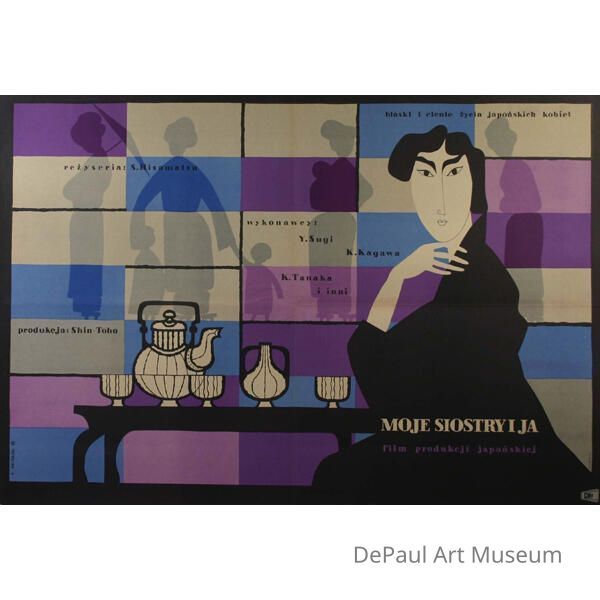Graphic background of colored rectangles (purple, blue and grey) with a somewhat stylized woman having tea. Silhouetted figures in the background. Japanese film poster.