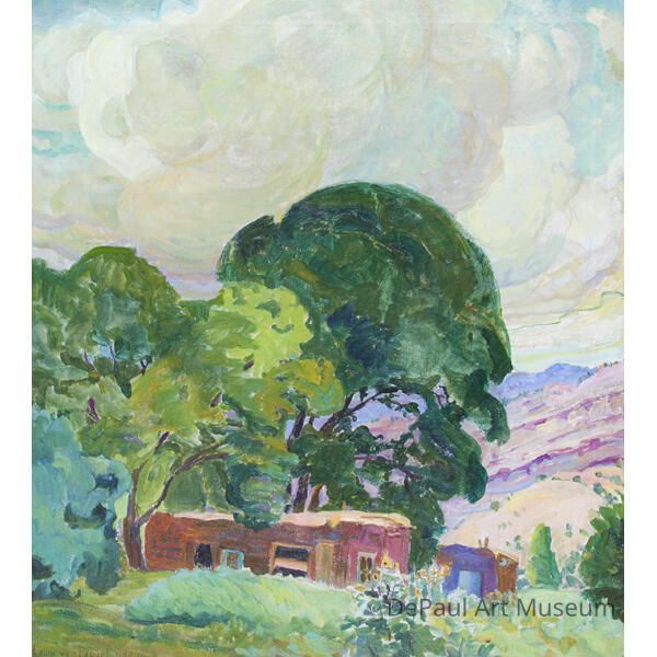 New Mexico Landscape, Taos is one of Van Pappelendam’s many paintings of the New Mexican landscape. The painting is built up from a warm and inviting color palette which depicts small cabin structure that rests on the edge of the foreground beneath a tree before the landscape recedes into the purple tinged mountains and foothills in the distance. Above the trees and valley large rolling clouds form from wide ample brushstrokes in greens and pinks, developing a sense of warmth and an untamed natural clarity that permeates the painting’s atmosphere. During her summer trips to New Mexico, where she spent the summers from 1920-27 and 1950-55, Van Pappelendam was known to frequently be accompanied by her younger brother where they would camp and she would paint the landscape. It is unclear whether or not the structure in the image belongs to either of them, but it is known that Van Papplendam enjoyed incorporating architecture into the landscape.Acquisition