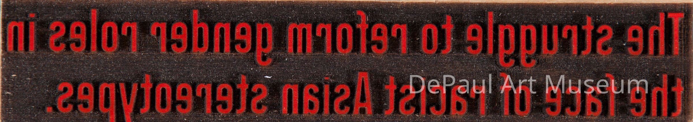 A stamp that reads 'The struggle to reform gender roles in the face of racist Asian stereotypes.' in red letters on a dark brown background.