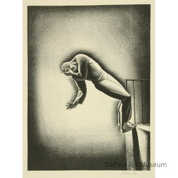 Man, clutching head while stretching one arm out, leaning out into empty space with his toes on a ledgeAcquisition