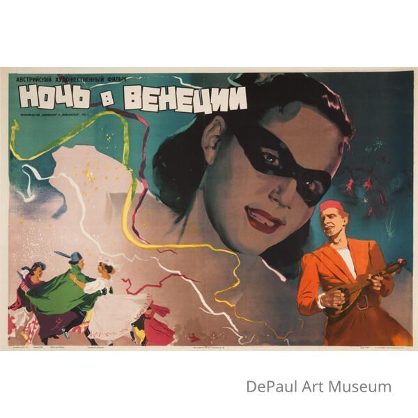 A woman wearing a mask and a man playing a mandolin. Russian film poster.